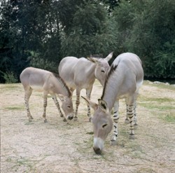I u „vyselektovaných“ somálských oslů původem z Nogalu (první transport) se občas vyskytuje náznak úhořího pruhu a ramenního kříže. Zoo Basilej, srpen 1981. Foto J. Volf / © J. Volf