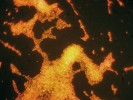 Plně vyzrálý biofilm je komplexní trojrozměrná struktura s mnoha odlišnými typy mikroprostředí, což přispívá k heterogenitě v mikrobiální populaci biofilmu. Různorodost je možné zviditelnit barvením akridinovou oranží. Výsledná barva je totiž ovlivněna poměrem RNA/DNA. Buňky s vysokým relativním obsahem RNA (rychle rostoucí buňky) se barví do oranžova až oranžovočervena, buňky s nízkým relativním obsahem RNA (pomalu rostoucí) do zelena až žlutozelena. Na snímku obarvený biofilm bakterie Staphylococcus epidermidis. Foto: V. Holá a F. Růžička