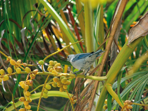 Tangara modrá (Thraupis episcopus) se v parcích a zahradách živí drobnými bobulemi. Foto J. Májsky