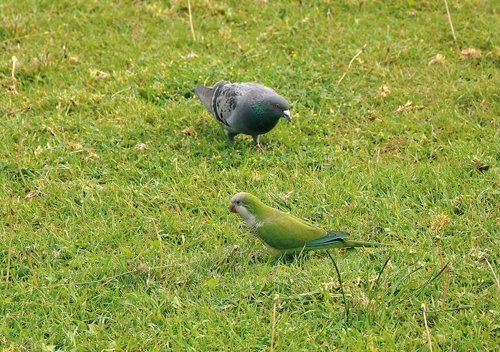 Papoušek mniší (Myiopsitta monachus) hnízdí v argentinských městech v koloniích. Na obr. je také kosmopolitně rozšířený holub skalní (Columba livia), resp. zdivočelý holub domácí (C. livia f. domestica). Foto J. Májsky
