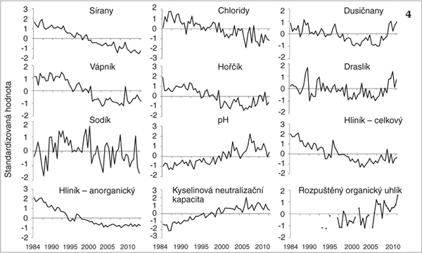 Dlouhodobé (1984–2012) standardizované hodnoty (průměr hodnot nula a jednotková variance) koncentrací chemických prvků a sloučenin v šumavských jezerech. Orig. autoři článku