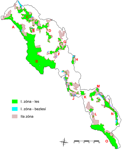 Obr. IX. Vymezení I. a IIa zóny podle návrhu Stínové vědecké rady NP Šumava. Bližší popis jednotlivých I. zón A až O uvádějí P. Kindlmann a kol. (2012) v knize Lesy Šumavy, lýkožrout a ochrana přírody (viz obr. 5 v tištěné Živě). Orig. K. Matějka (s využitím dat Správy NPŠ a autorů návrhů)