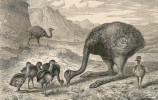 Nandu pampový (Rhea americana) – nepříliš běžný příklad ptáků, kde se o potomstvo stará samec. Za jméno vděčí matce Dia, Títánce Rheie. Orig. A. Brehm, Život zvířat (Praha 1927).