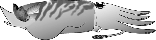 Rekonstrukce egyptosépie Aegyptosaepia lugeri v předpokládané životní pozici. Podle dat získaných z dírkovců (Foraminifera) je zřejmé, že egyptosépie žily hlouběji než jejich současní potomci. Orientace těla v prostředí se také lišila a předpokládáme u nich polohu mezi svislou a vodorovnou pozicí. Orig. M. Košťák