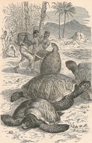 Mořská želva kareta obrovská (Chelonia mydas) – jmenovec mýtického fryžského krále. Obývá teplá moře a oceány celého světa, pláží vhodných k inkubaci jejích vajec však všude ubývá. Orig. A. Brehm, Život zvířat (Praha 1927).
