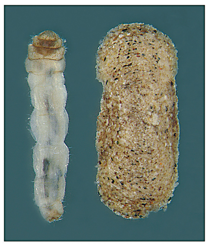 Schránky ve tvaru pouzdra na brýle (vpravo) vytvářejí larvy bahnomilky Thaumastoptera calceata (na snímku vlevo vypreparovaná ze schránky). Délka larvy dosahuje nejvýše 5 mm. Foto M. Horsák