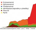 Evoluce cévnatých rostlin na časové ose a schematické vyjádření zastoupení jednotlivých skupin. Orig. M. Štech, podle různých zdrojů
