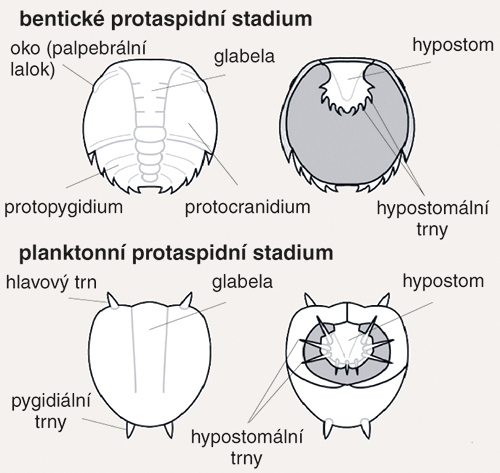 Typická morfologie bentického protaspidního stadia připomínající dospělce (nahoře) a planktonního, dospělcům nepodobného protaspidního stadia (dole), vždy z hřbetní (vlevo) a břišní strany (vpravo). Podle: R. A. Fortey a B. D. E. Chatterton (1988) a L. Laibl a kol. (2014), upraveno