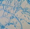 Konidiofory druhu Talaromyces marneffei připomínají stavbou příbuzný rod štětičkovec (Penicillium), do něhož byl tento druh houby dříve i řazen. Zvětšení 1 000×. Foto A. Kubátová