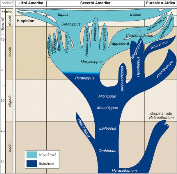 Asi před 10 miliony let se v Severní Americe dala do pohybu jedna z nejlépe doložených migrací koní. Byl to okruh tzv. hipparionů, kteří se vyvinuli ze spodnomiocenního rodu Merychippus. Beringovou úžinou zaplavili několika druhy Eurasii a Afriku, osídlili tam stepi i lesostepní prostředí v povodí velkých vodních toků, např. evropského Rýna. Původní názor, že to byli přímí předci pravých koní, se nepotvrdil – šlo o jednu z úspěšných, ale slepých vývojových linií. Rekonstrukce rodu Hipparion. Orig. P. Major, v odborné spolupráci s O. Fejfarem
