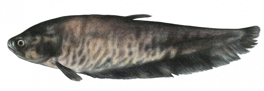 Nožovec africký (Papyrocranus afer) – barevná „fáze“ obývající povodí Cavally v Libérii a Pobřeží slonoviny s velkými světlými a početnými skvrnami po celém těle a řitní ploutvi. Orig. R. Bošková