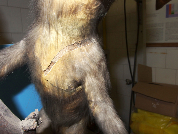 Popraskaná kůže preparátu vlivem nízké relativní vlhkosti vzduchu při uložení. Foto z archivu autorů
