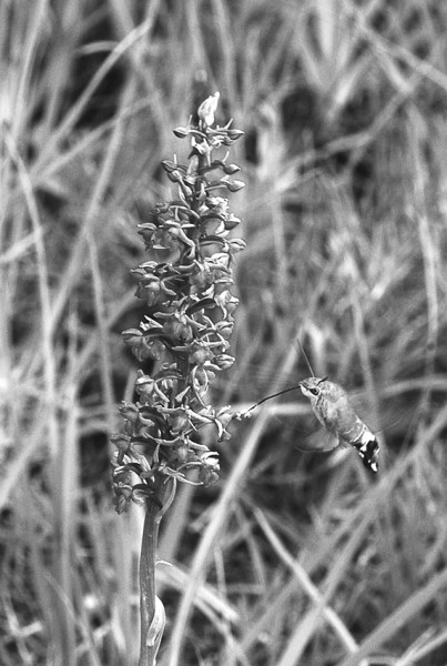 Denní lišaj dlouhozobka svízelová (Macroglossum stellatarum) sající nektar z pětiprstky hustokvěté (Gymnadenia densiflora). Na konci sosáku jsou vidět přichycené balíčky pylu – brylky. Foto J. Jersáková