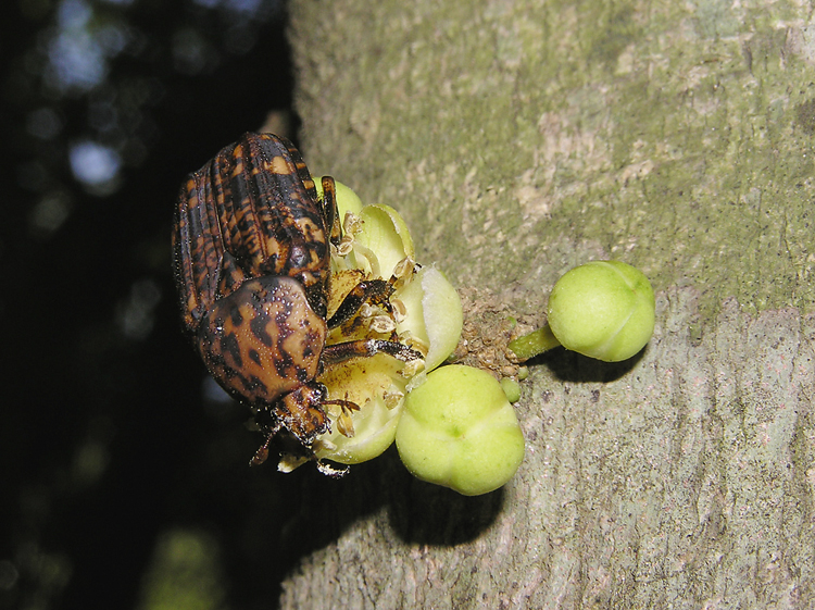 Miskovitý květ se snadno dostupným hojným nektarem tropického stromu Drypetes natalensis (Putranjivaceae) opylují zlatohlávci Porphyronota hebraea. Foto J. Jersáková