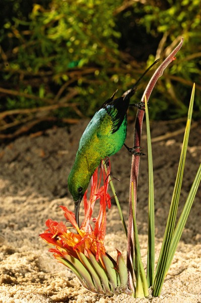 I mimo Ameriku existují silně specializované polinační vztahy ptáků a ornitofilních rostlin. Strdimil kamerunský (Cyanomitra oritis) při sání nektaru z květu netýkavky Impatiens sakeriana třepotá podobně jako kolibříci. Foto Š. Janeček