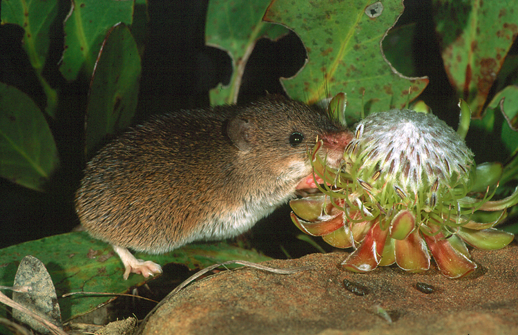 Bodlinatka Acomys subspinosus líže nektar protey bezlodyžné (Protea acaulos, proteovité – Proteaceae). Jižní Afrika. Foto S. D. Johnson