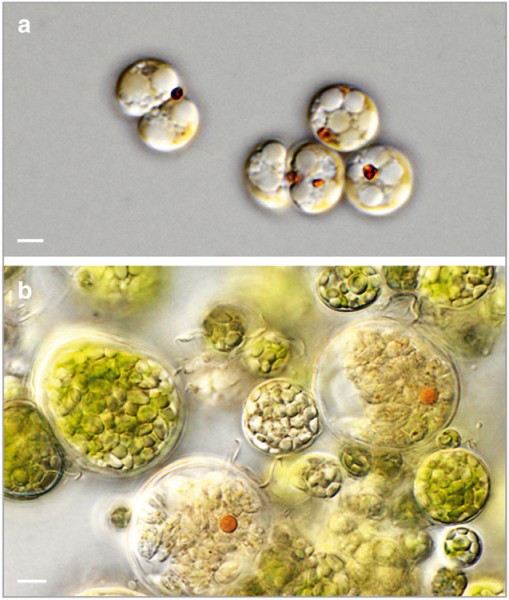 Chromeridní řasy korálnatka ukrytá (Chromera velia, obr. a) a skleněnka zelnotvará (Vitrella brassicaformis, b) v optickém mikroskopu. Nepohyblivé vegetativní buňky korálnatky měří 5–7 μm v průměru, sporangia skleněnky až 30 μm. Zelená autosporangia obsahují desítky autospor, nezelená zoosporangia s oranžovým tělískem desítky zoospor. Měřítko 2 μm. Foto D. Modrý