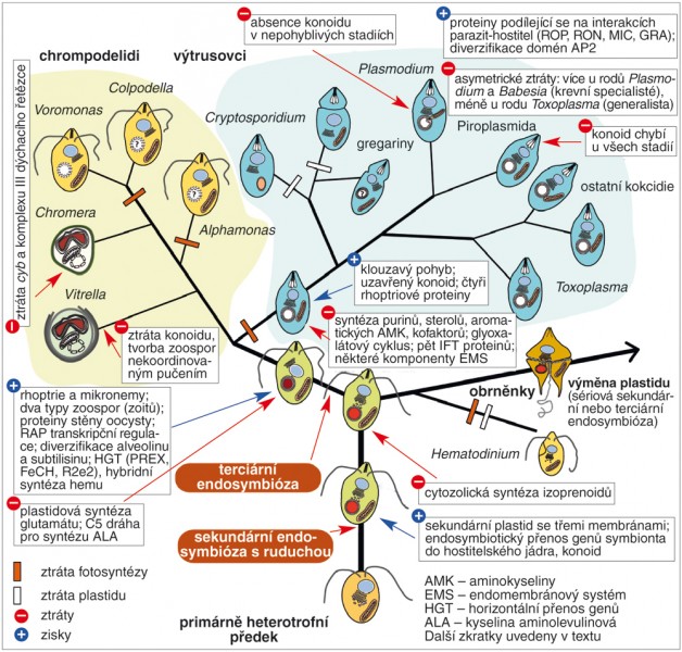 Schéma evoluce chrompodelidů a výtrusovců. Ve fylogenetickém stromě jsou vyznačeny důležité ztráty a akvizice genů a struktur, včetně ztráty fotosyntézy a samotného plastidu. Orig. M. Oborník