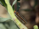 Housenky hnědáska květelového (Melitaea didyma) žijí pospolitě jen na samém začátku žíru, po většinu vývoje jsou samostatné. Na fotografii vzrostlá housenka na lnici kručinkolisté (Linaria genistifolia). Hnanice, duben 2019. Foto M. Vrba