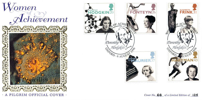 Ukázka z obálky prvního dne vydání (FDC). D. M. Hodgkinová, která potvrdila pomocí rentgenové krystalografie strukturu penicilinu, a kolonie houby Penicillium notatum. Velká Británie 1996 Snímek z archivu A. Novákové