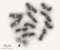 Metafáze prvního meiotického dělení buněk z varlat samce ostníka šestiskvrnného (Ero aphana) s 11 chromozomovými páry v bivalentech. Šipka označuje dva pohlavní chromozomy X1 a X2, které jsou v tomto období meiózy výrazně despiralizované (dekondenzované), tedy po nabarvení méně kontrastní. Chromozom Y samcům rodu Ero chybí. Foto M. Kotz