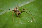 Mládě ostníka šestiskvrnného (Ero aphana) vysává skrze nohu plachetnatku (Neriene cf. peltata). Foto T. Killick.