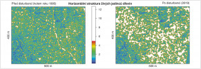 Zobrazení horizontální struktury lesa před disturbancí (zhruba r. 1995) a po ní (2019) na přeshraniční ploše (rozměry 500 × 400 m) v oblasti Špičníku. Struktura je vyjádřena pomocí distribuce volného prostoru bez dřevin. Vzdálenost každého bodu k nejbližšímu vyskytujícímu se živému jedinci dřeviny (jakékoli výšky) ukazuje barevná stupnice do 5 m. Bílé oblasti mají tedy vzdálenost k nejbližšímu jedinci dřeviny větší než 5 m. Orig. autoři článku