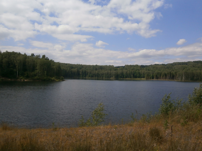Zatopený hnědouhelný lom Boží požehnání u Kynšperku. Od ukončení těžby ve 40. letech 20. století se v něm udržovala snížená hladina kvůli stabilitě železničního tělesa. Dvakrát ročně při jarním a podzimním promíchání způsobovaly rozpuštěné sloučeniny železa anoxii celého vodního sloupce. Po zpevnění železničního tělesa stoupla hladina v roce 2015 o 13 m a maximální hloubka vzrostla na 34 m, voda má průhlednost kolem 5 m a u hladiny je trvale prokysličená. Pod chemoklinou v hloubce 10 m je voda trvale bez kyslíku. Foto I. Přikryl