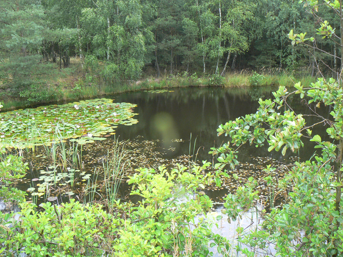 Drobný starý zatopený kaolínový lom nedaleko předchozí lokality vypadá naopak velmi přirozeně, byť záměrně vysazené lekníny vnímá biolog na první pohled. Foto I. Přikryl