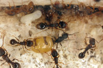 Vpravo nahoře (vyznačeno šipkou) je nepříliš dobře viditelný zvětšený zadeček královny mravence bachratého (Anergates atratulus) a zároveň o něco níže vlevo (také šipka) se nachází královna druhého parazita – mravence cizopasného (Strongylognathus testaceus). Je o něco větší než okolní dělnice hostitelského mravence drnového (Tetramorium caespitum) a má nápadně konkávní týlovou oblast hlavy, vybíhající po stranách v jakési „rohy“. Vlevo nahoře jsou nakladená vajíčka a larvy prvního instaru. Foto V. Souralová
