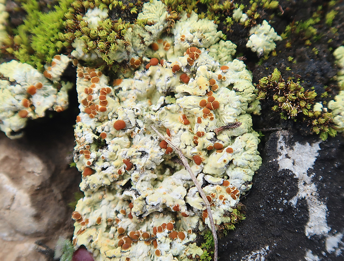 Detail horní plošky exponovaného skalního výchozu vápence s minimálně 7 druhy lišejníků. Některé mají endolitickou stélku, tedy zanořenou do vrchní navětralé vrstvy skalního podloží. Přirozené skalní výchozy jsou na rozdíl od lomových odkryvů na lišejníky často velmi bohaté. Foto D. Svoboda