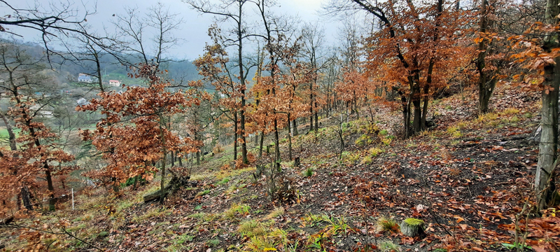 Prosvětlená část habrové doubravy na jižním svahu Boubové, kde je opad každoročně odstraňován od podzimu r. 2020 (následně po vegetačním snímkování) na 16 plochách umístěných v porostu obnovovaného středního lesa. Foto Jan Douda