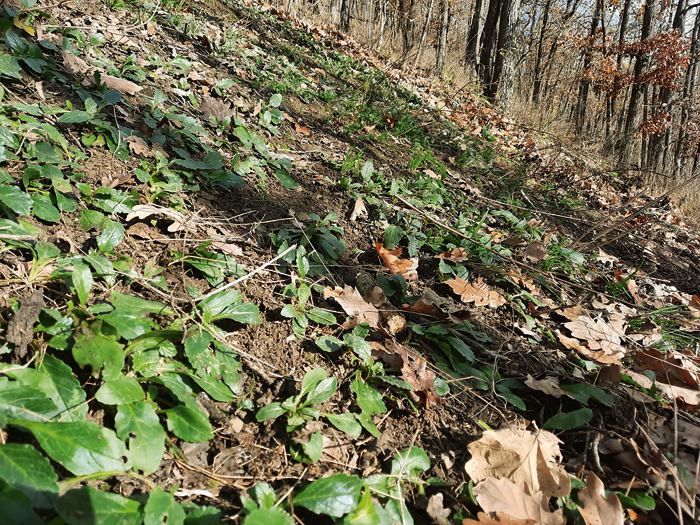 Pohled na čerstvě založenou plochu s odstraněným opadem nacházející se na svahu kopce Vysoká stráň nad vsí Hostim v Českém krasu, kde je vyhrabávání uplatňováno jako cílený ochranářský management na větších souvislých plochách v rámci aktivit neziskového spolku Třesina. Foto J. Douda