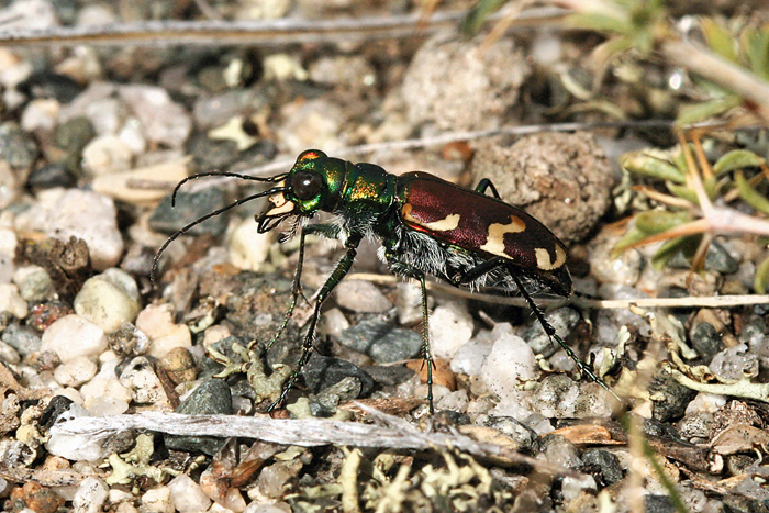 Z lesních požárů profitují druhy, které oheň k životu potřebují, i ty, které potřebují místa bez stromů, jaká jim může zajistit oheň, pastva nebo třeba pojezdy těžké techniky. Sibiřský svižník Cicindela coerulea nitida. Foto L. Čížek