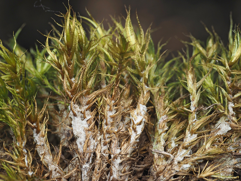 Bělavé, vatovité tomentum připomínající „plíseň“ vybíhá po lodyze u běžně se vyskytujícího druhu mechu dvouhrotce čeřitého (Dicranum undulatum) až téměř k vzrostnému vrcholu celé rostliny. Foto L. Janošík