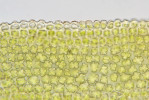Příčný řez listem xerotermního mechu patřásnatky Hornschuchovy (Pseudocrossidium hornschuchianum), kde je patrné výrazné, dolů orientované spirálovité svinutí okrajů listů i papilnatost buněčné stěny buněk jednovrstevné čepele. Jde o zástupce v ČR nejpočetnější čeledi pozemničkovitých (Pottiaceae). Foto L. Janošík