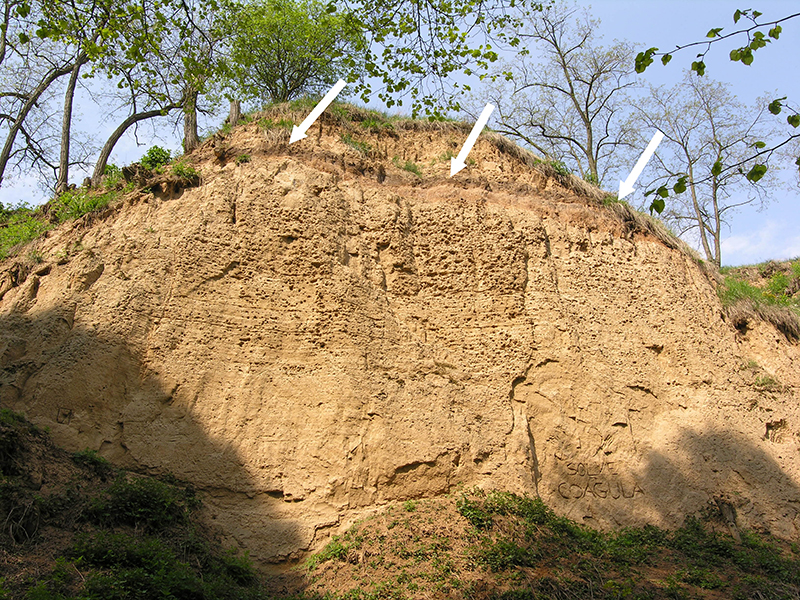 Sprašová rokle u Zeměch západně od Kralup nad Vltavou. Šipkami je označena fosilní půda předposledního interglaciálu. Foto R. Mikuláš
