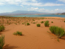 Částečně zpevněná duna červeného pískovce. Nádrž v pozadí je umělá a je zásobena vodou z řeky Virgin River. Sand Mountain (1 221 m n. m.), Utah, USA. Foto R. Mikuláš
