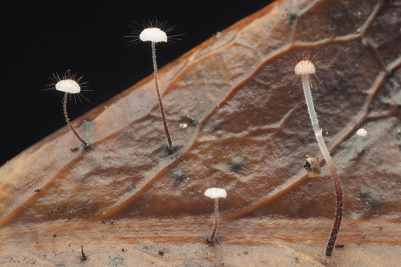 Drobné plodnice špičky Marasmius hudsonii na listech cesmíny (Ilex). Klobouky s lupeny jsou nad povrch opadu vynášeny na dlouhém třeni, který pomáhá rozšířit bazidiospory do větší vzdálenosti od plodnice. Foto L. Janošík