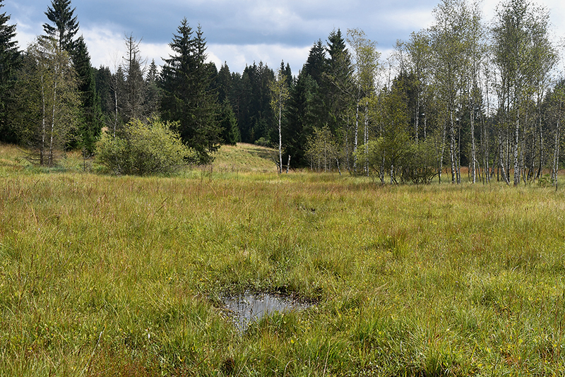 Prameniště u Pasečné na Šumavě. Biotop s výskytem mnoha rašeliništních druhů, kterému však chybí narušování. Rostou zde oba triploidní hybridi z okruhu sítiny článkované, zatímco žádný z rodičovských druhů tu nalezen nebyl. Foto P. Koutecký