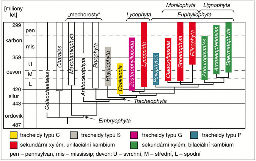 Zjednodušené fylogenetické schéma s hlavními skupinami suchozemských rostlin a typem jejich xylému. Současný platný pohled je na rozdíl od tohoto obr. s monofyletickými mechorosty sesterskými cévnatým rostlinám; suchozemským rostlinám jsou pak nejpříbuznější spájivky (viz Živa 2021, 2: 57–59). Upraveno podle: C. Strullu-Derrien a kol. (2013)