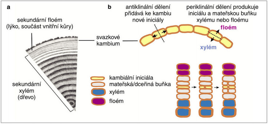Bifaciální kambium produkuje sekundární xylém centripetálně a sekundární 4floém centrifugálně. Iniciály, tedy buňky s trvalou schopností buněčného dělení, se zároveň antiklinálně dělí a kambium tak může zvětšovat svůj průměr. Upraveno podle: R. Spicerová a A. Groover (2010)