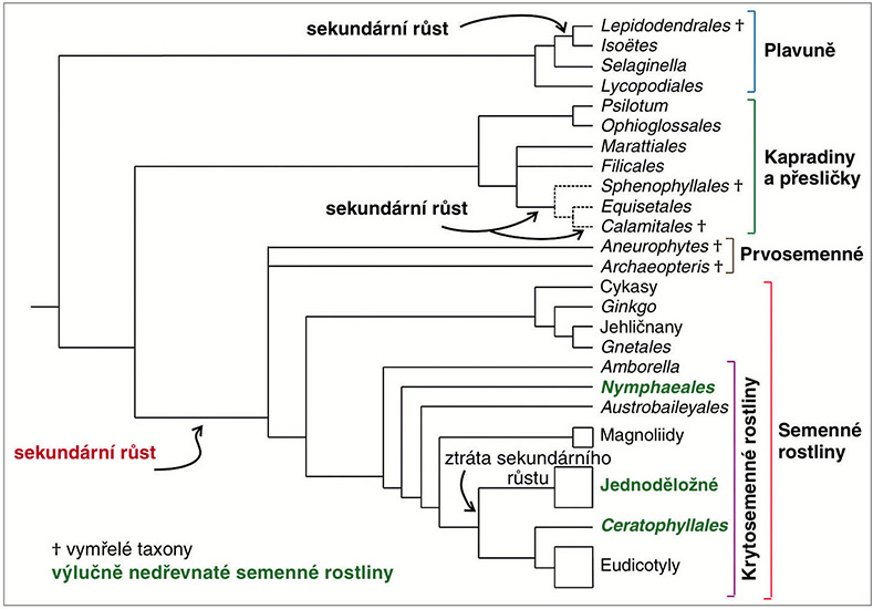 Fylogeneze cévnatých rostlin ve vztahu k několikanásobnému objevení se svazkového kambia. U všech skupin, vyjma Lignophyta (viz sekundární růst červeně), jde o unifaciální kambium produkující pouze sekundární xylém. Upraveno podle: R. Spicerová a A. Groover (2010)