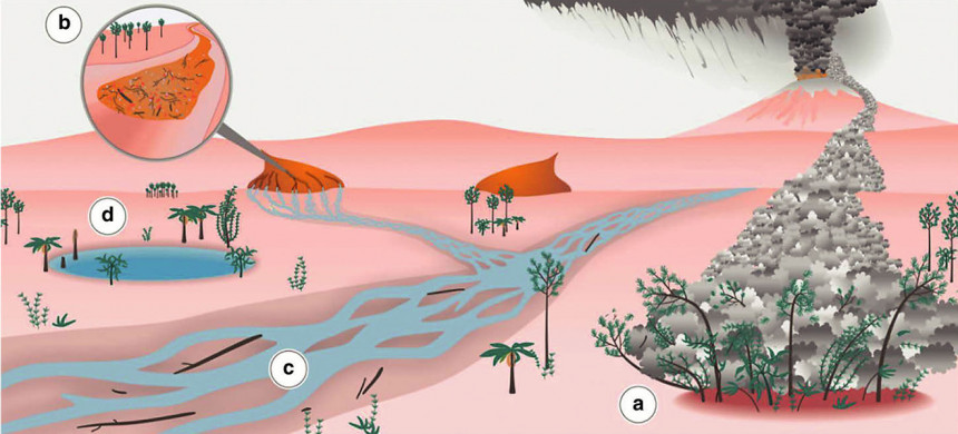 Ukázky různých reálných prostředí, kde u nás vznikala zkamenělá dřeva: a – pyroklastický příval (Rokle u Kadaně) s přímým vlivem vulkanismu, b – lahar (Kadaň) s nepřímým vlivem vulkanismu, obojí paleogén Doupovských hor, c – sedimenty divočící řeky (Nová Paka) bez vlivu vulkanismu, svrchní karbon podkrkonošské pánve, d – zkamenělá rašelina tvořená v jezerním prostředí s nepřímým vlivem vulkanismu (Balka), hranice karbon/perm podkrkonošské pánve. Převzato z publikace S. Trümpera a kol. (2018), upraveno pro ilustraci českých příkladů s pomocí V. Rappricha