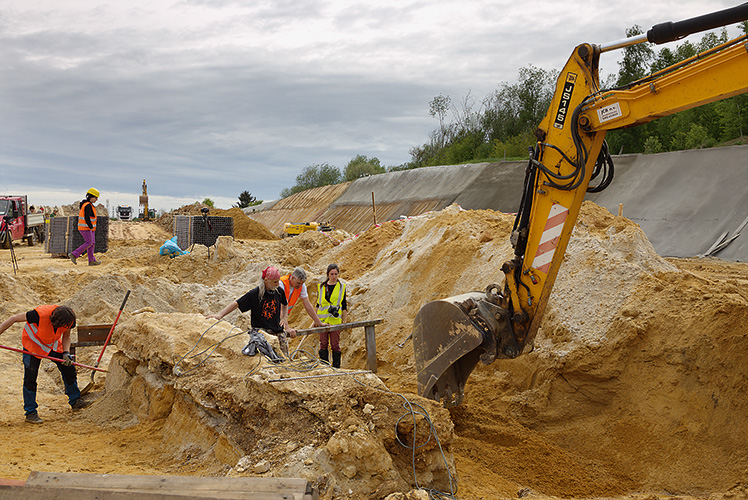 Záchranné práce na vyzvednutí 7 m dlouhého kmene (č. F5006) na lokalitě Pohůrka u Českých Budějovic pracovníky Národního muzea na jaře 2021, klikovské souvrství, českobudějovická pánev. Stáří asi 85 milionů let. Na snímku zleva M. Libertín, P. Daneš a J. Kvaček (NM) a S. Venclová (Jihočeské muzeum). Foto laskavě poskytl J. Kvaček.