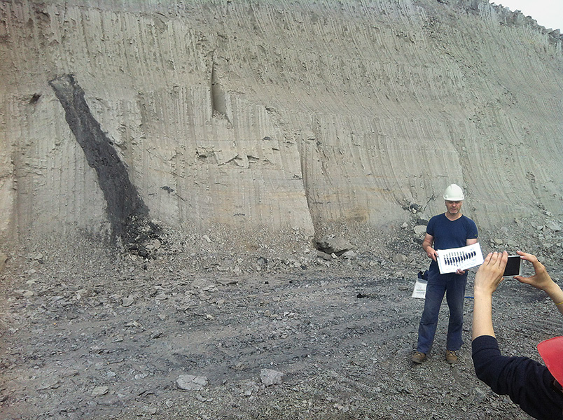 „Pařezový horizont“ (č. 31) v těsném nadloží hlavní uhelné sloje na Dolech Bílina, ve kterém vystupují xylitické kmeny v růstových pozicích (in situ). Mostecké souvrství, stáří asi 18 milionů let. Na snímku Karel Mach (Severočeské doly, a. s.) při studentské exkurzi (29. května 2015). Foto J. Sakala