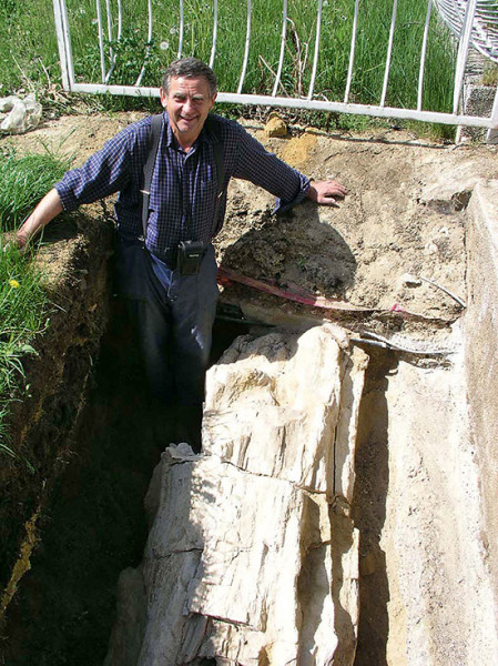 Výkop zkamenělého kmene v areálu Nemocnice Kadaň, zachovaného v laharu doupovského vulkanického komplexu. Lokalita Kadaň – Zadní vrch, stáří asi 30 milionů let. Na snímku z r. 2003 je geolog František Foltýn. Foto laskavě poskytl J. Prokop.