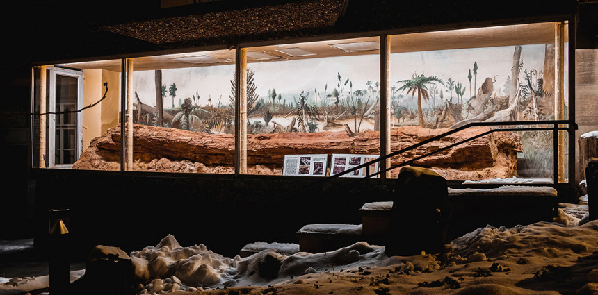 Zkamenělý kmen v Klenotnici drahých kamenů Městského muzea Nová Paka. Jeden z našich nejdelších zkamenělých kmenů, 8,5 m dlouhý, nalezený ve štikovských arkózách kumburského souvrství podkrkonošské pánve. Stáří asi 300 milionů let. Foto laskavě poskytl V. Mencl.