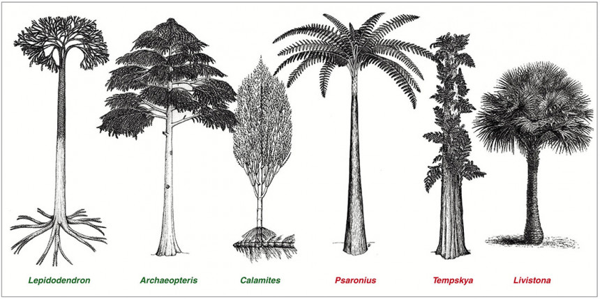 Ukázka stromovitých typů rostlin: pozdnědevonská prvosemenná Archaeo pteris, karbonský plavuňovitý Lepidodendron a přesličkovitý Calamites vytvářejí sekundární xylém (zeleně), zatímco kapradinovité rostliny – karbonský Psaronius a pozdněkřídová Tempskya – jakož i recentní palma Livistona sekundární xylém netvoří a vyrůstají ve stromovité typy jen díky primárním pletivům (červeně). Velikosti jednotlivých typů nejsou proporcionální. Upraveno podle: M. J. Donoghue (2005), s použitím internetových zdrojů pro obraz palmy