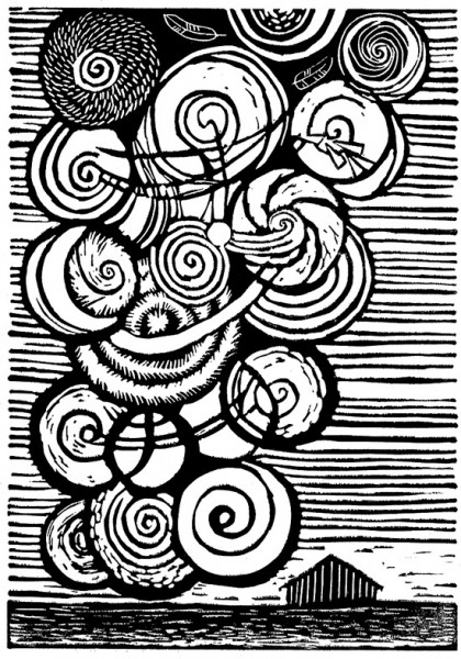 Prachové bouře v americké Oklahomě ve 30. letech 20. století inspirovaly Johna Steinbecka k napsání knihy Hrozny hněvu. Linoryt. Orig. J. Klimešová